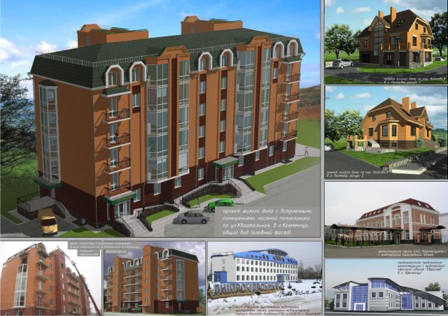 Жилой дом с медицинским центром (1-й этаж) и офисными помещениями (подвал).Адрес: г. Кременчуг, ул. Квартальная.Выполненные работы: Проектирование: комплексный проект, авторский надзор.Строительство: субподрядные работы по возведению мансарды.Комплексное проектирование.